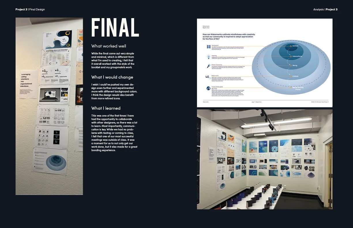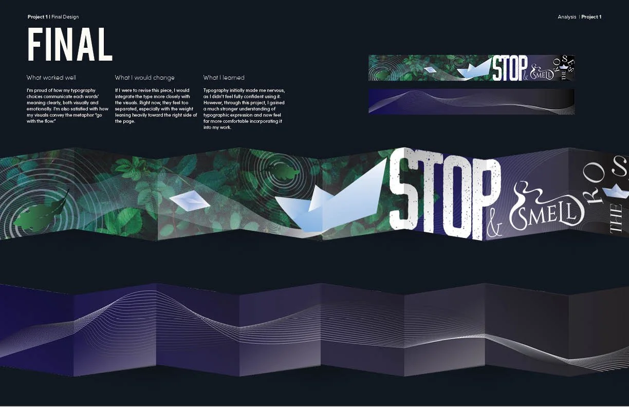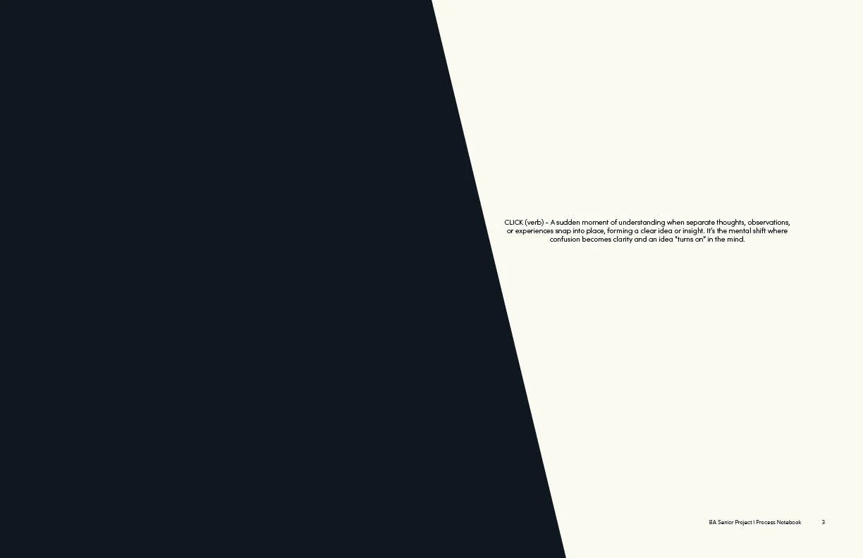 Overall, I wanted the work to speak for itself. To achieve this, I designed the pages to be clean and minimal, allowing the images to take center stage. By showcasing each project as large and clearly as possible, I aimed to highlight not only the final outcomes but the full creative process behind them. Each section includes sketches, drafts, and iterations, revealing how my thumbnails almost never resemble the final result. This was intentional, as I wanted to show how my ideas evolve through exploration, experimentation, and continual refinement, capturing the true nature of the design process.